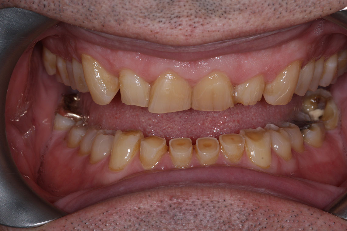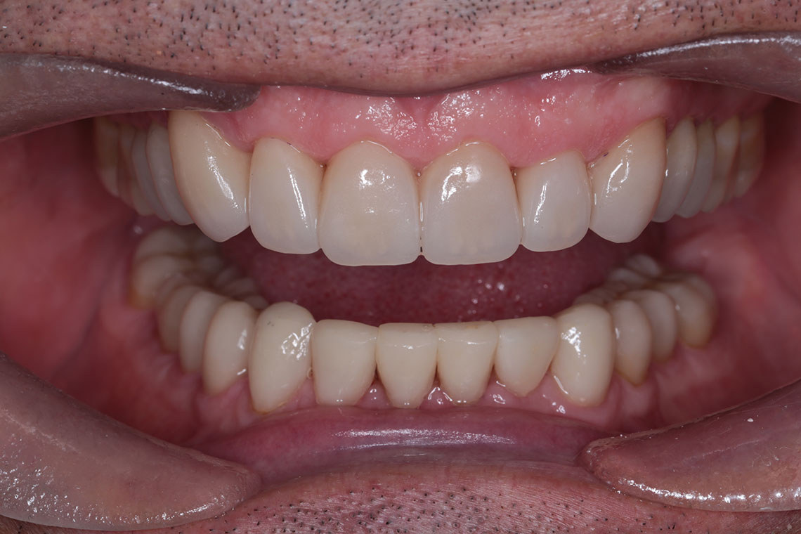 his lovely gentleman had severe tooth wear from grinding and wanted to transform his smile and bite. We first designed all the new shapes and bite positions using a digital smile design. We followed this up with a trial smile phase to make sure he could get used to the new bite and shapes. Finally we rebuilt the whole mouth using a combination of ceramic no preparation onlays and veneerlays for the back teeth. We used composite bonding to rebuild the lower front teeth and the backs of the upper front teeth. Finally we placed porcelain veneers to the upper six teeth to rebuild the front surfaces of them. We finished this case by providing a Michigan nighttime splint to protect the work.